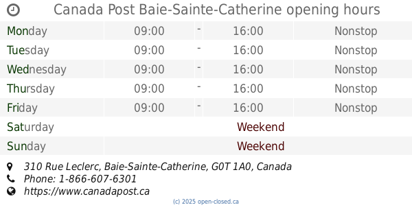 It is also possible to : Edit these OPENING HOURS of Branch Canada Post In Baie-Sainte-Catherine, 310 Rue Leclerc,